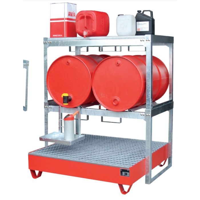 Vatenstelling-aftapstation van verzinkt staal voor twee 200 liter vaten en legbord voor vloeistof-kleinverpakkingen. Set met gelakt stalen lekbak inclusief verzinkt rooster. Rek met inrijbeugels, geschroefde uitvoering, 2-voudig stapelbaar, bouwpakket met opbouwinstructie voor zelfmontage.