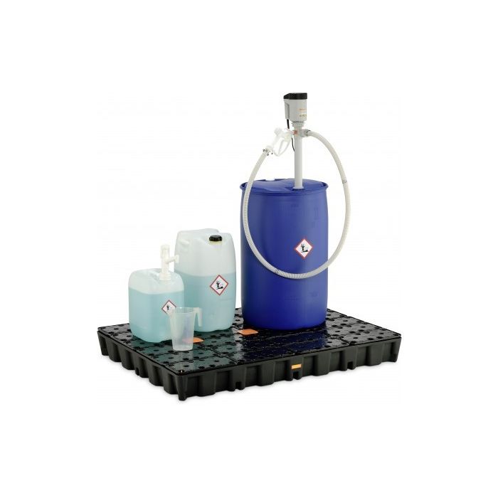 - Mocht er vloeistof lekken uit een jerrycan of drum dan zorgt de lekbak er direct voor dat de vloeistof wordt ingedamd.