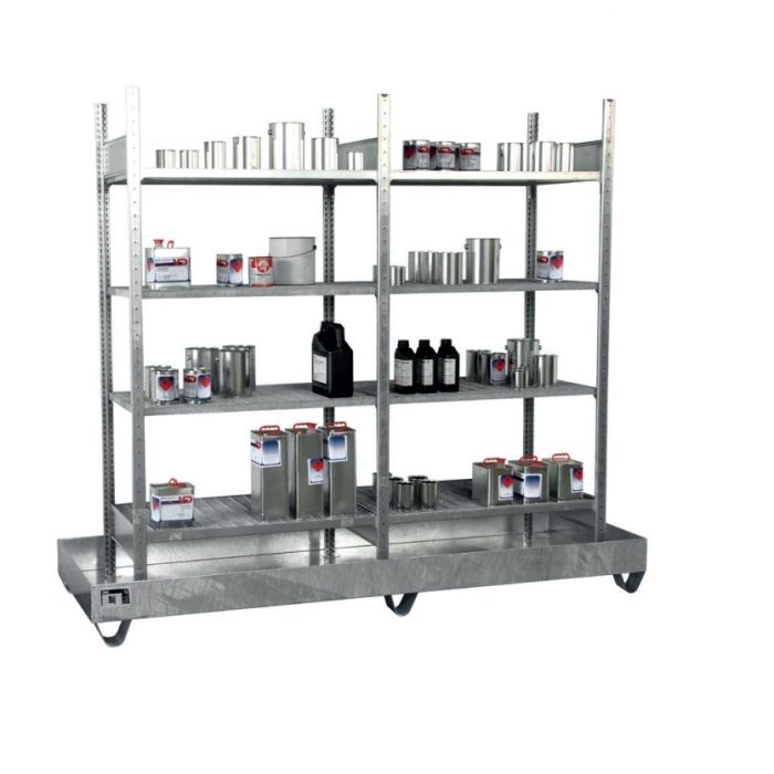 Dubbel stellingrek met lekbak voor veilige opslag van kleine verpakkingen, olie-en vetspuiten etc.