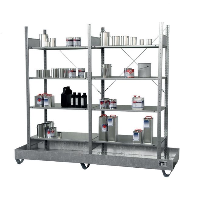 Dubbel stellingrek met lekbak voor veilige opslag van kleine verpakkingen, olie-en vetspuiten etc.