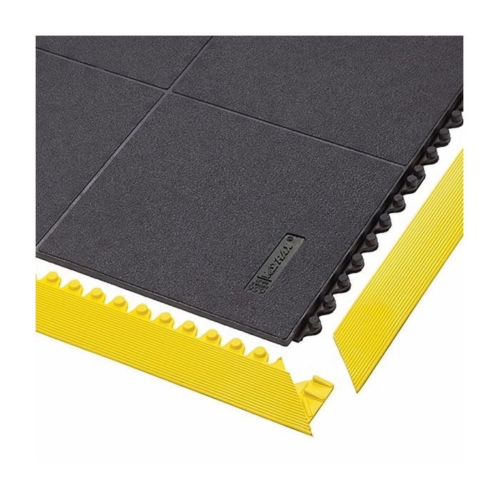 Rubbertegels van 91 cm x 91 cm voor intensief gebruik kunnen gemakkelijk geassembleerd worden voor het bedekken van grote oppervlakten of individuele werkplekken. Ergonomisch comfort door een 19 mm dik werkplatform met een gesloten antislip kiezelmotief voor maximaal antivermoeidheidscomfort in droge industriële omgevingen. Compatibel met gepatenteerd MD Ramp System™ voor slimme veiligheidsranden oplossingen, voor binnen- en buitenhoeken. Slipvastheid R9 volgens DIN 51130.