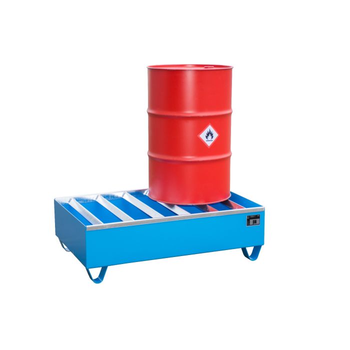 Gelakte lekbak voor 2 vat van 200 liter of klein emballage. Voor een veilige opslag van verpakte gevaarlijke stoffen overeenkomstig PGS 15, VLAREM, ARAB, CODEX
