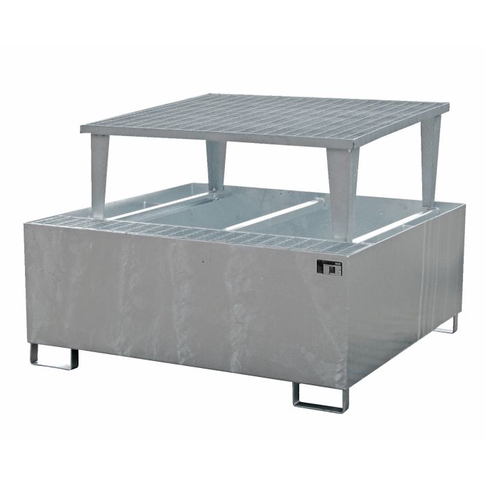 Staal verzinkte IBC lekbak voor 1 IBC / KTC van 1.000 ltr. Voor een veilige opslag van verpakte gevaarlijke stoffen overeenkomstig PGS 15 (voorheen CPR 15-1), VLAREM, ARAB, CODEX