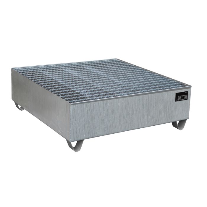 Staal verzinkte lekbak met sokkelpoten voor 4 vaten van 200 liter. Voor een veilige opslag van verpakte gevaarlijke stoffen overeenkomstig PGS 15, VLAREM, ARAB, CODEX.