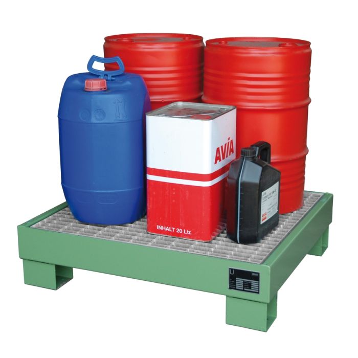 Stalen gelakte lekbakken, met rooster voor 2 vaten à 60 liter. Voor een veilige opslag van verpakte gevaarlijke stoffen overeenkomstig PGS 15 & VLAREM.