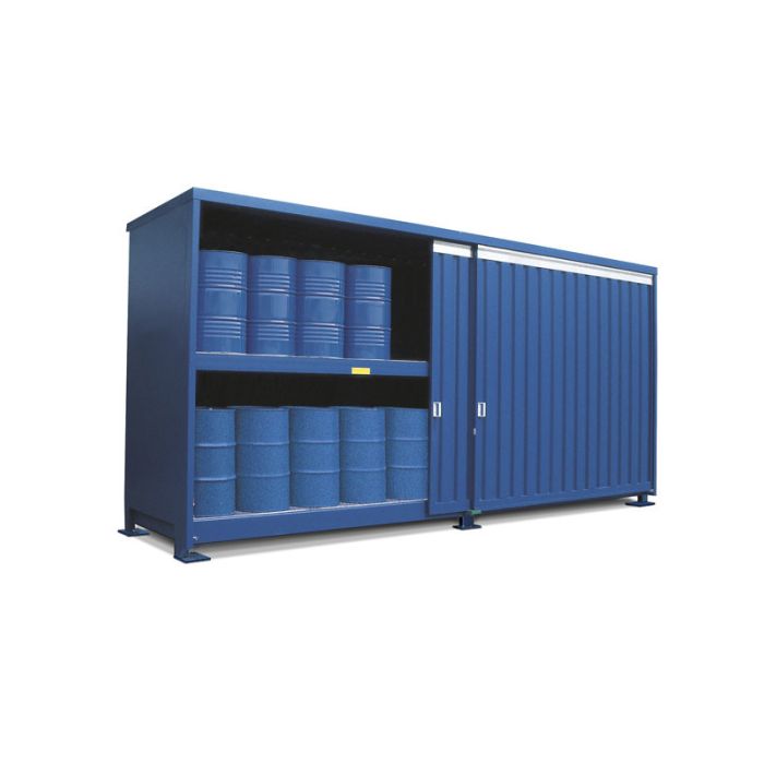 Met 2 opslagniveaus geschikt voor staande en liggende vaten, alsook kleinverpakkingen. Schuifdeuren aan de lange zijde, geïntegreerde stalen opvangbak, vrij van de ondergrond.