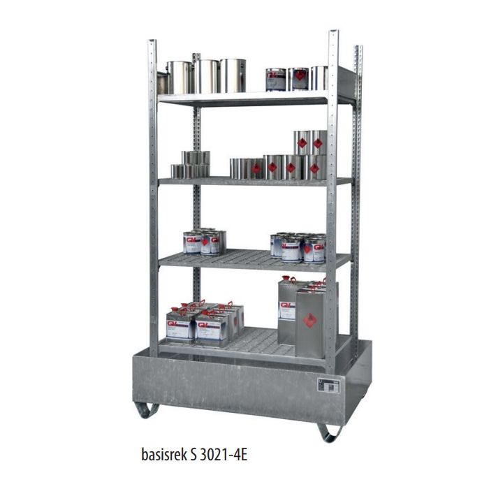 Stellingrek met lekbak voor veilige opslag van kleine verpakkingen, olie-en vetspuiten etc.