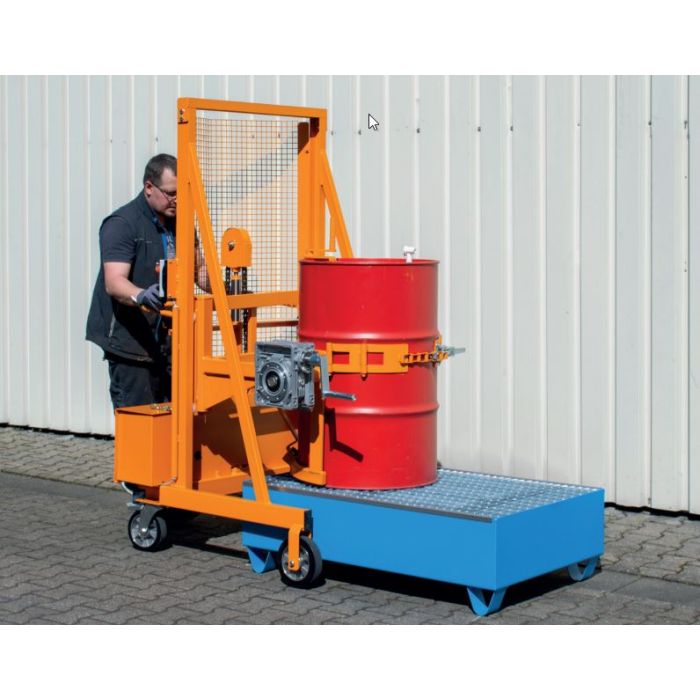 Vatenlifter en vatenkantelaar met electrische hefbediening: Veilig en gemakkelijk plaatsen van stalen en kunststof vaten. Geschikt om te transporteren, heffen, mengen, draaien en gedoseerd te legen van stalen en kunststof vaten. Gemakkelijk te verrijden door 2 zwenkwielen en 2 bokwielen van stalen en kunststof vaten.